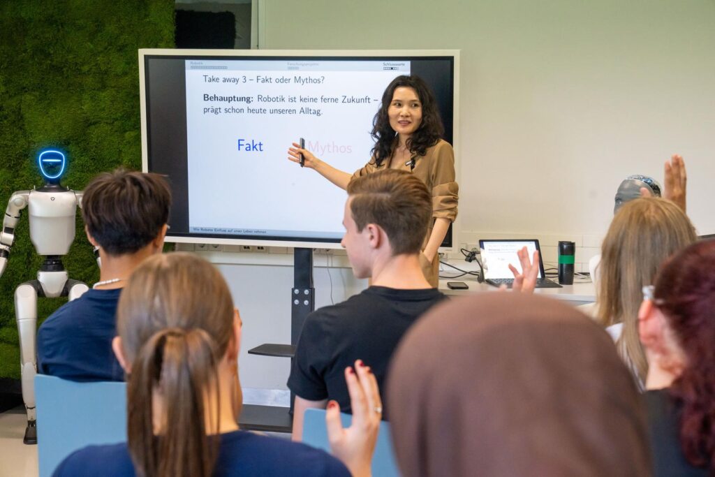 In einer Projektwoche zum Schuljahresstart setzten sich die Zehntklässler*innen mit der Frage auseinander: Wie verändert KI unser Leben und unseren Lebensraum? Neben Impulsvorträgen zu Robotik und Stadtplanung mit KI-Bezug standen auch Begegnungen mit humanoiden Robotern, Exkursionen und szenische Übungen im Staatstheater Cottbus auf dem Plan.